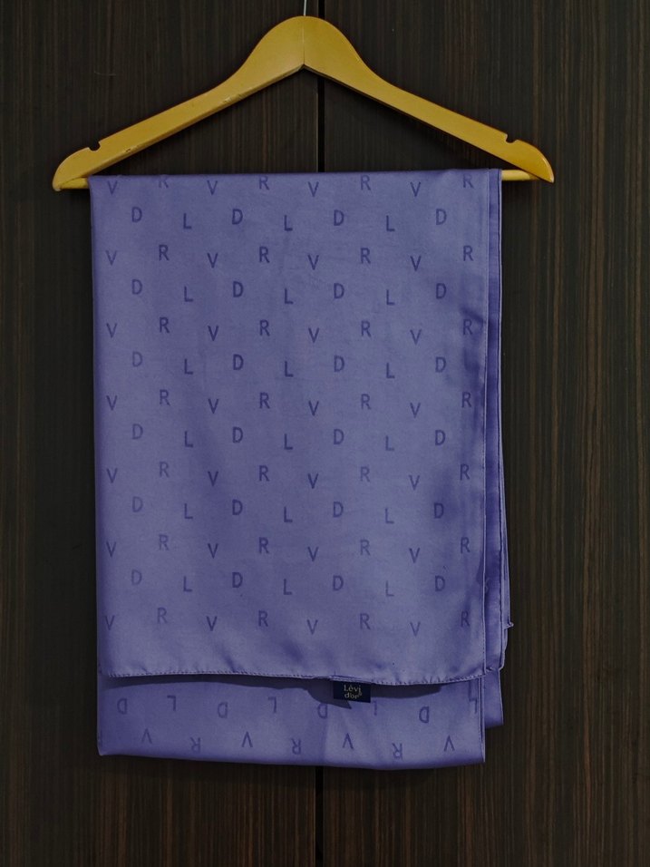 Koyu mor renkte, saten dokulu ve drapeli kadın şal. Üzerinde 'R', 'D', 'L' harfleri desenli, minimalist ve şık bir tasarım sunar.