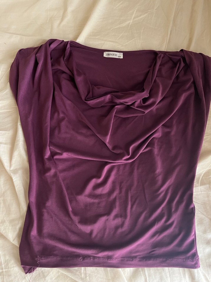 Mor, kayık yaka ve drapeli detaylı, vücuda oturan kadın bluz. Yumuşak ve parlak kumaştan, cesur goth tarzı için uygun. 2 kere falan giydim çok şık duruyor