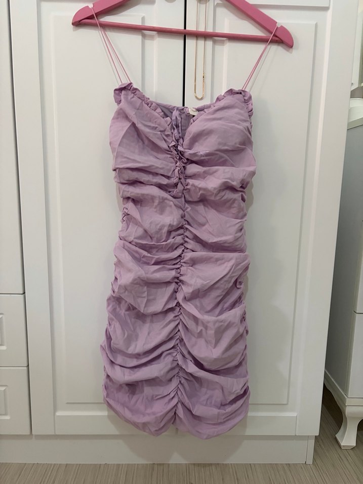 Bu mor pastel renkli midi elbise, straplez yaka ve ince askılarla, drapeli ve büzgülü tasarıma sahiptir. Bağlama desenli, minimalist ve şık bir parti elbisesidir. Küçük beden için uygun dar kesimdir. Butikten almıştım m beden etiketi ama dar kesim 34- xs bedene uygun olur