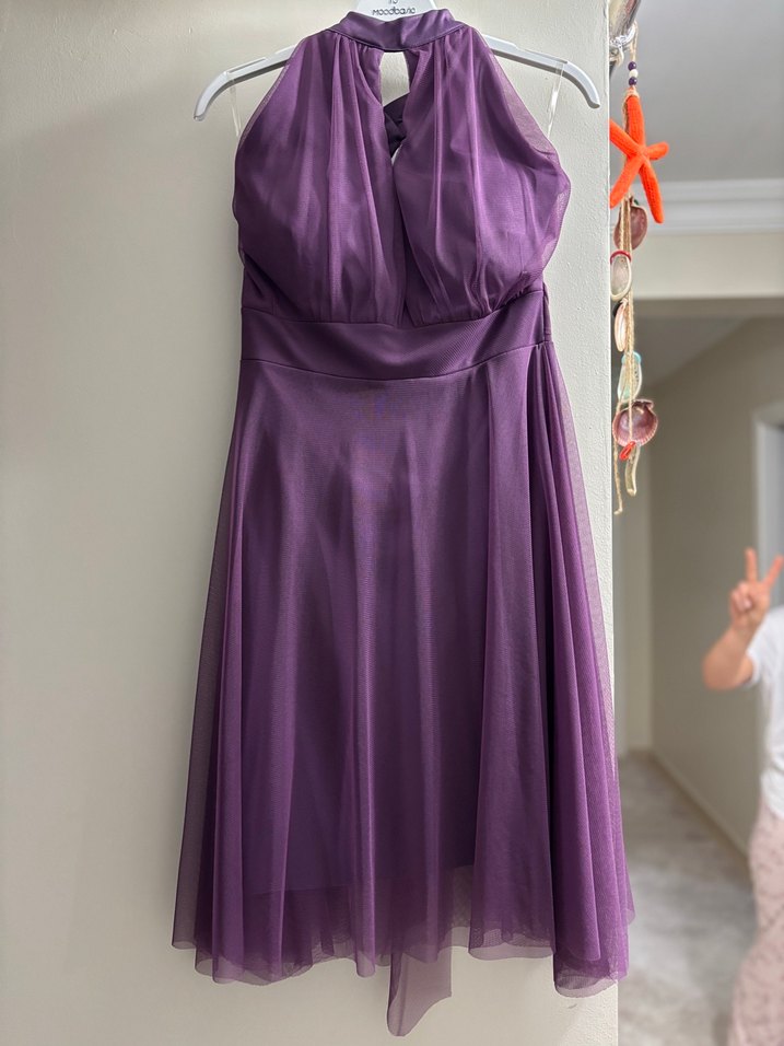 Mor, drapeli, straplez ve ince askılı, midi uzunlukta, parlak görünümlü abiye elbise.