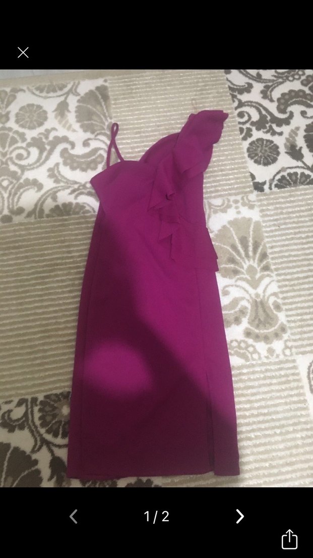 Mor renkli midi boy abiye elbise, straplez yaka ve drapeli detaylara sahiptir. Kolsuz ve vücuda oturan kesimiyle parti için uygundur.