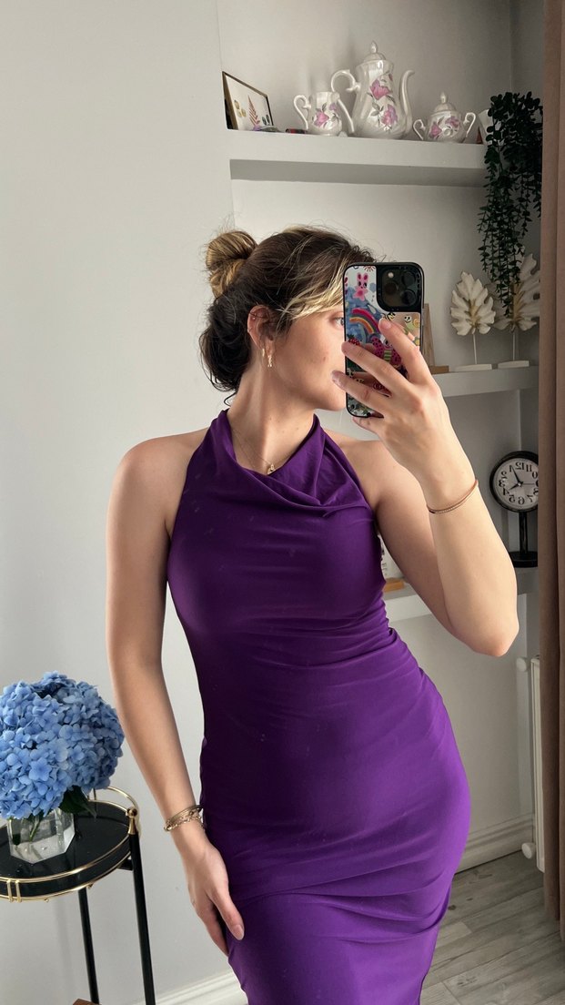 Mor renk drapeli yüksek yakalı ve askılı kollu, mor renkli, vücuda oturan midi abiye elbise. Tie-dye deseniyle modern ve gösterişli.