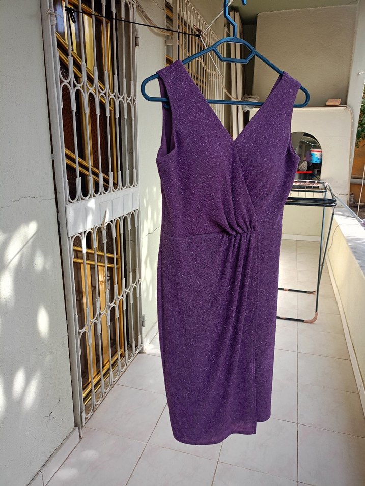 Parlak mor kumaştan, drapeli ve V yakalı, kolsuz, vücuda oturan midi boy abiye elbise.Ürün bir defa doğum günü konseptinde sadece 2 saatliğine giyilmiştir. Hiçbir şekilde sorun yoktur sorunsuz yenidir. Ürünün sadece etiketi yoktur. Duruş ve zarafet şıklığıyla ortamlarda farkınızı ortaya çıkarır.
