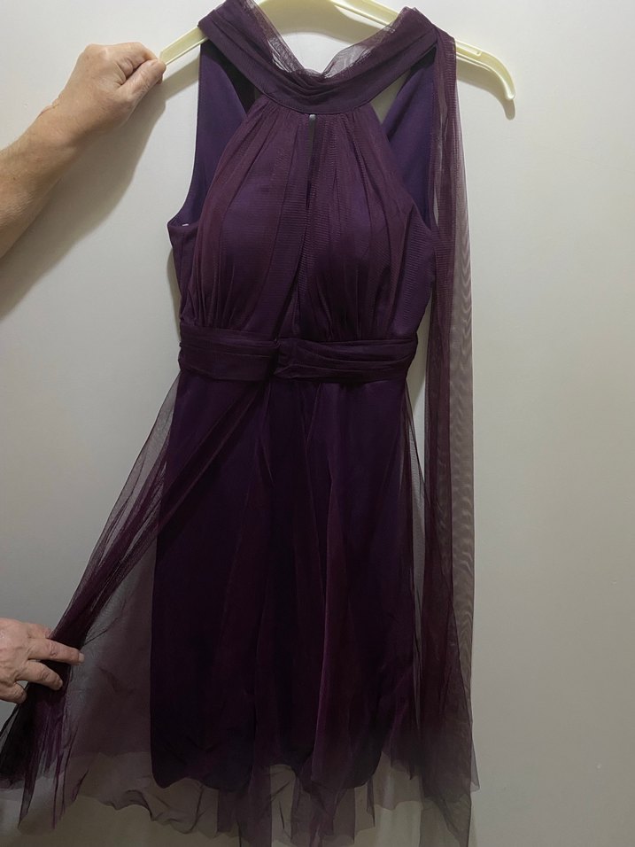 Mor renkte, drapeli, yüksek yakalı ve kolsuz düğün/mezuniyet elbisesi