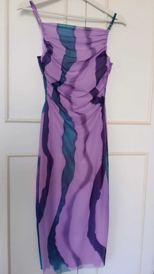 Askılı, drapeli ve vücuda oturan kesimiyle midi boy elbise. Pastel mor tie-dye deseni ve ipeksi kumaşıyla vücuda oturur. S beden uyumlu.