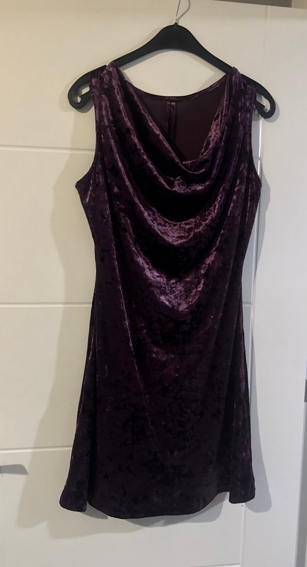 Bu mor, drapeli V yakalı, kolsuz ve diz boyu elbise, fitted kesimi ve desensiz tasarımıyla romantik akşamlar için ideal.