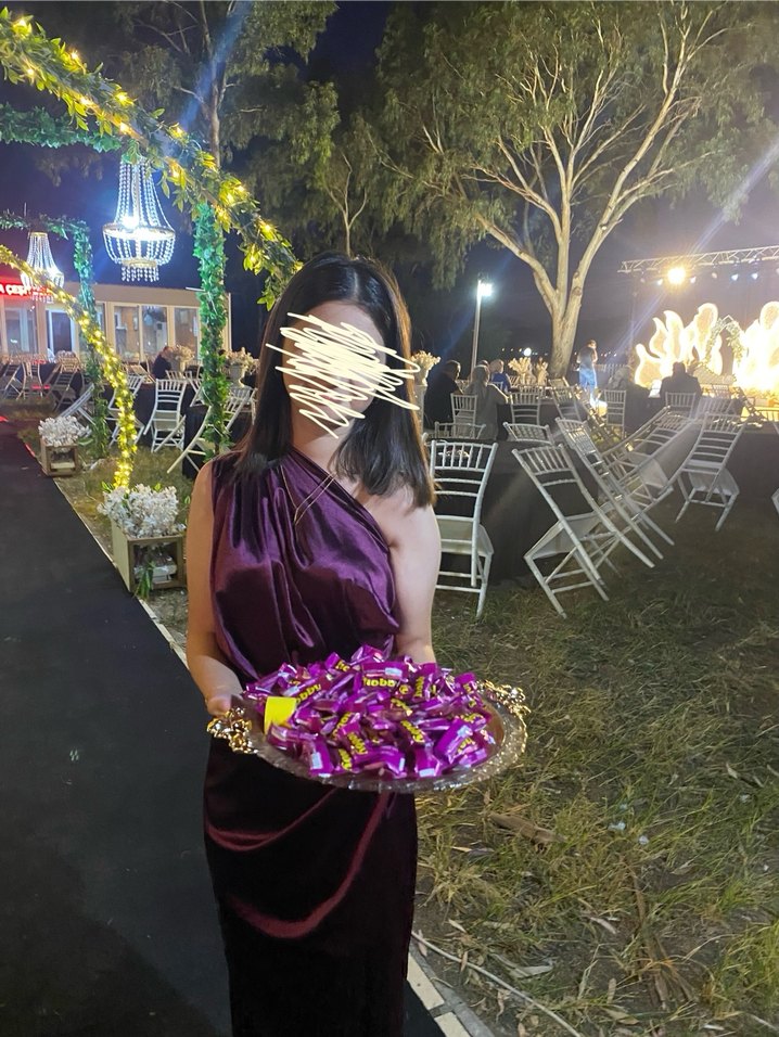Koyu mor, drapeli ve bağlamalı askılı, fitted kesim midi elbise, avant-garde tarzda parti için uygun.