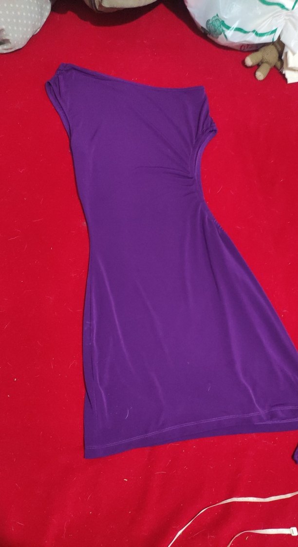 Mor, drapeli, mini boy, tek kol ve kayık yaka abiye elbise. Parti için uygun şık bir model.