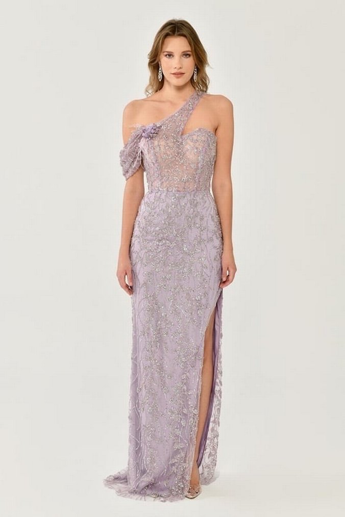 Bu straplez abiye elbise, drapeli tasarımı ve nakış detaylarıyla dikkat çekiyor. Uzun, vücuda oturan kesimi ve kolsuz yapısıyla gösterişli düğünler için ideal. Yırtmaçlı