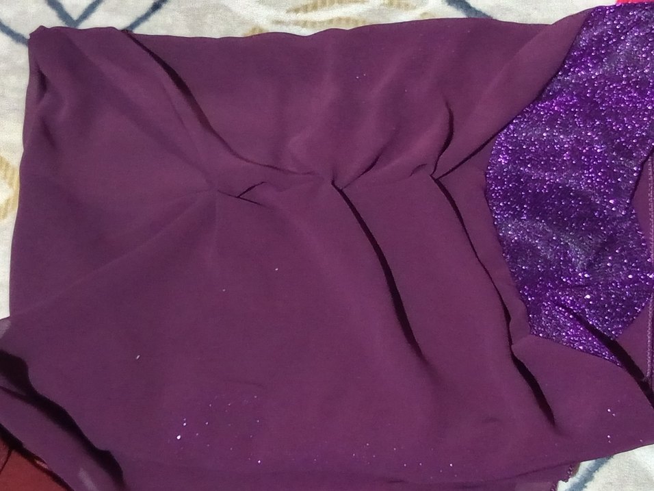 Drapeli tasarıma sahip, tek renk parlak mor önü simli çapraz model olan şifon şal.