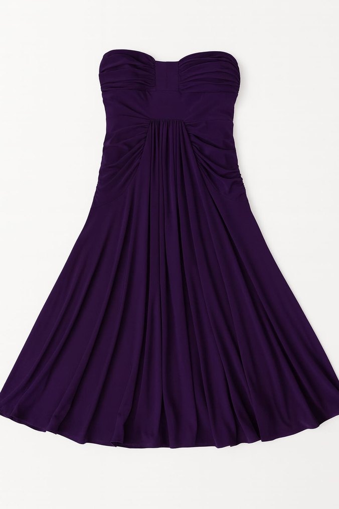 Bu mor drapeli straplez abiye elbise, vücuda oturan kesime ve uzun boyuta sahiptir. Kolsuz tasarımıyla gösterişli parti anlarına uygundur.