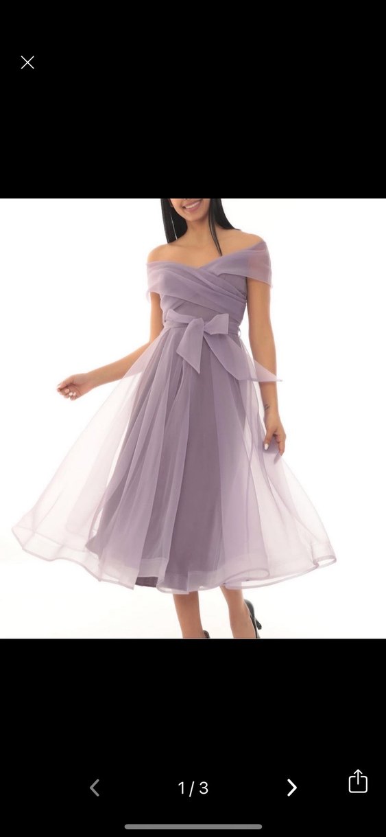 Uzun, pastel mor renkli abiye elbise, straplez yakaya ve drapeli detaylara sahiptir. İnce askılı, belinde fiyonk detayı bulunur, düğünler için uygundur.