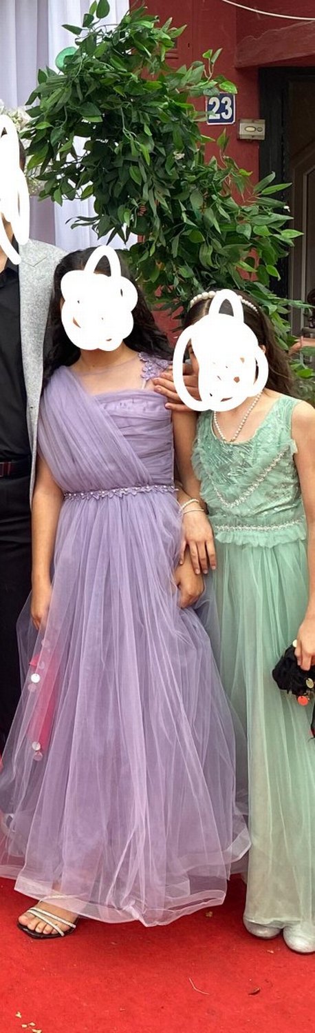 Fitted kesim, straplez yakalı, mor renkte drapeli kız çocuk abiye elbisesi. Yumuşak sentetik kumaştan, bohem tarzda tasarlanmıştır. sadece 1 kere giyildi