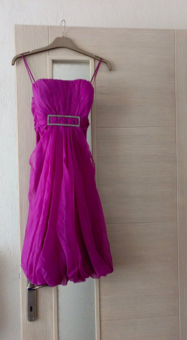 Bu mor abiye elbise, straplez ve ince askılı, drapeli tasarıma sahip. Parlak kumaş ve belde süslü toka ile düğünler için uygun, şık ve modern.