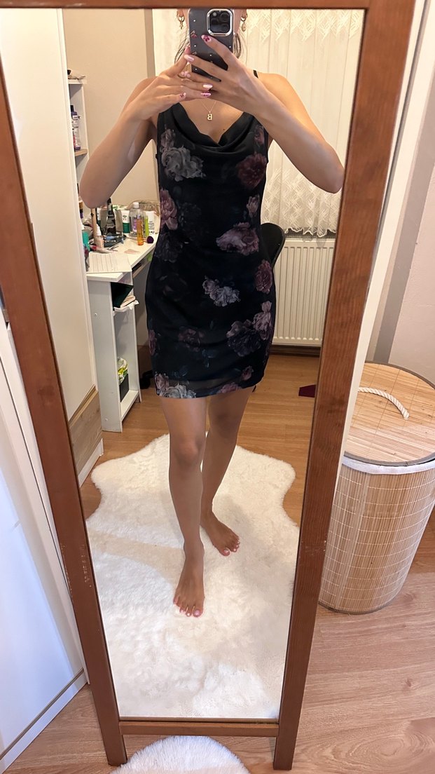 Drapeli yakalı, straplez, mor tonlarında tie-dye desenli, vücuda oturan midi elbise. Yumuşak ve ipeksi dokuda, cesur ve romantik geceler için uygun.