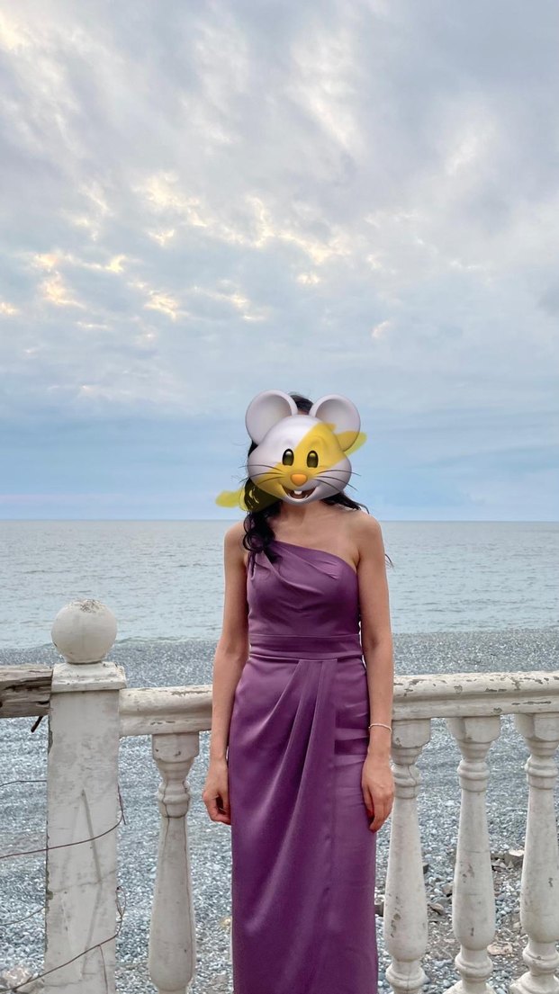 Mor pastel tonlarda, drapeli ve straplez kesime sahip, vücuda oturan midi uzunlukta mezuniyet elbisesi. Parti için şık ve avant-garde bir seçenek. Bir defa giyilmiştir temiz