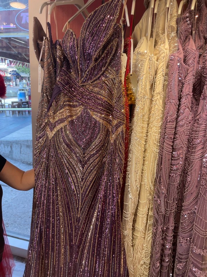 Mor, parlak desenli kumaştan, drapeli ve V yakalı, kolsuz, uzun ve vücuda oturan nişan elbisesi. Kardeşimin düğününden giydim sadece 1 kere. Detaylı fotoğraf gönderim olacaktır.