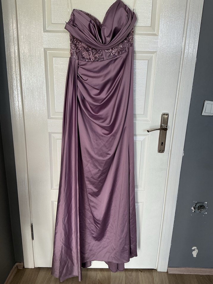 Vücuda oturan, straplez uzun abiye elbise, drapeli ve nakışlı detaylara sahiptir. Parlak mor kumaşıyla düğünler için şık bir seçimdir.