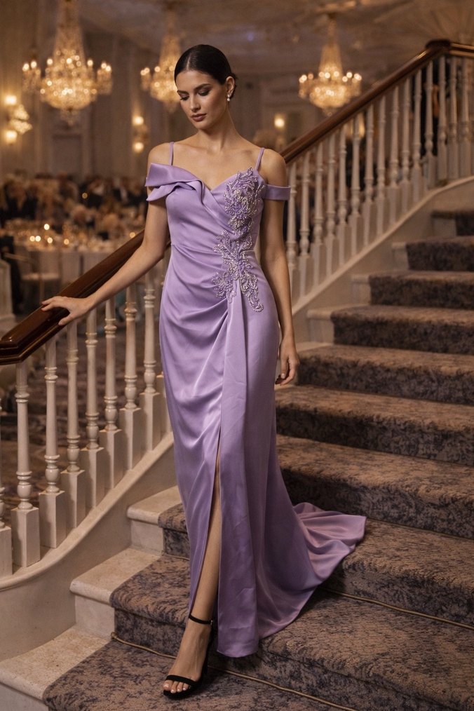 Mor renkte, drapeli ve işlemeli detaylı uzun abiye elbise. Straplez yaka ve askılı kollara sahip, düzenli kesim ile düğünler için uygun. ✨