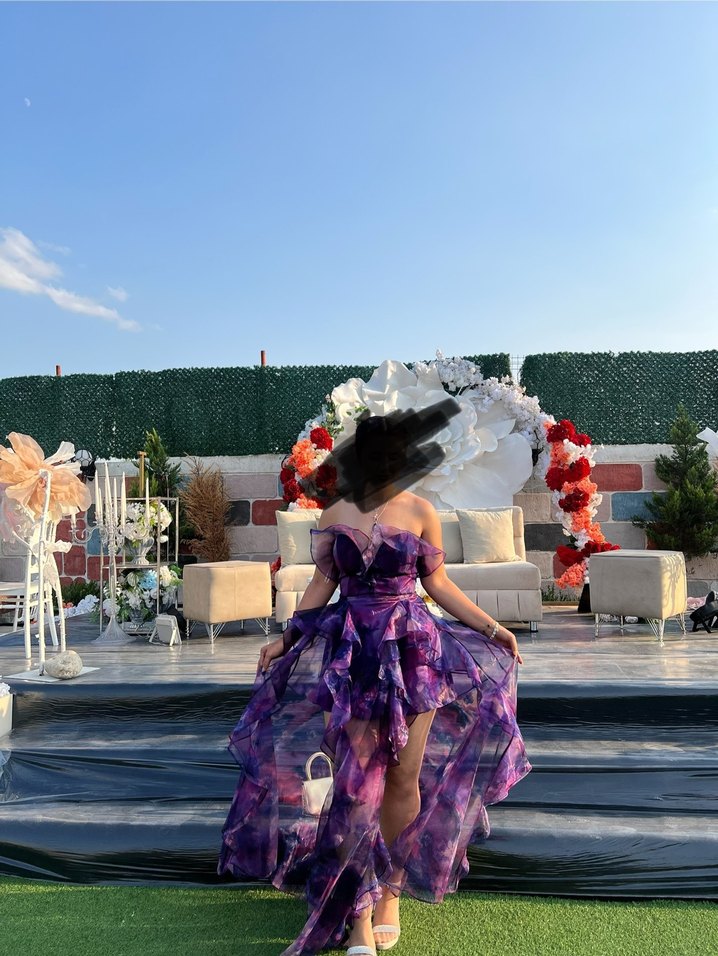 Bu mor, straplez nişan elbisesi koyu tie-dye deseni ve drapeli uzun katmanlarıyla şık bir stil sunar. Sadece 1 defa birkaç saat giyildi. Herhangi bir defo veya sorunu yok etiketi yeni söküldü.