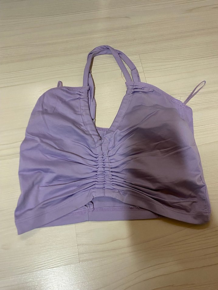 Mor renkte, drapeli ve askılı detaylı, vücuda oturan sentetik kumaş crop top. Günlük sokak modasına uygun rahat bir parça.