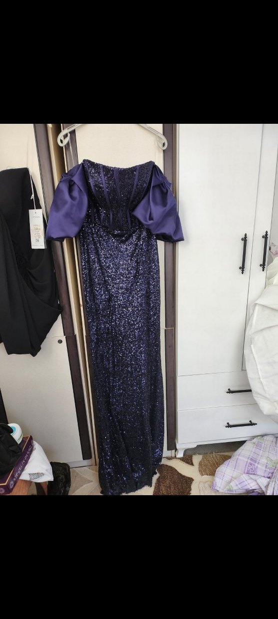 lacivert renkte, askılı ve drapeli uzun abiye elbise. Parlak, desenli kumaştan yapılmış, düğün gibi özel anlar için uygundur. ✨