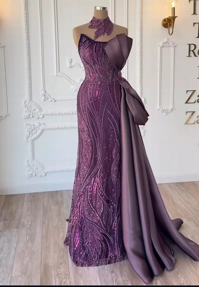 Mor renkte, straplez ve kolsuz uzun abiye elbise. İşlemeli desenleri ve drapeli detaylarıyla düğünler için uygundur.