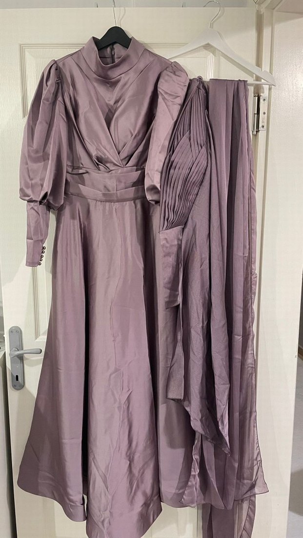 Mor renkli, uzun ve drapeli bu abiye elbise yüksek yakalı ve uzun kolludur. Düzenli kesim ve modern klasik stile sahip, düğünler için uygundur. Kumaşı pürüzsüz ve desensizdir, vintage şıklığı sunar. şalıyla birlikte gönderilecektir.