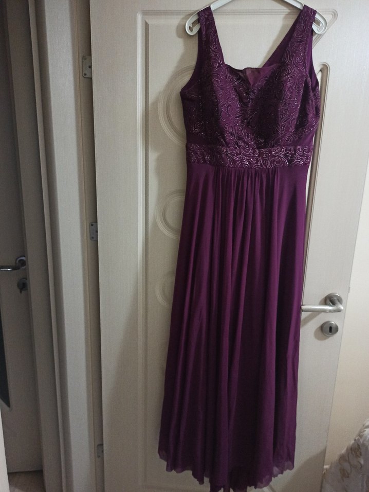 Mor renkte, drapeli V yakalı, kolsuz ve vücuda oturan uzun abiye elbisedir. Düğünlerde şık bir tercihtir. ✨