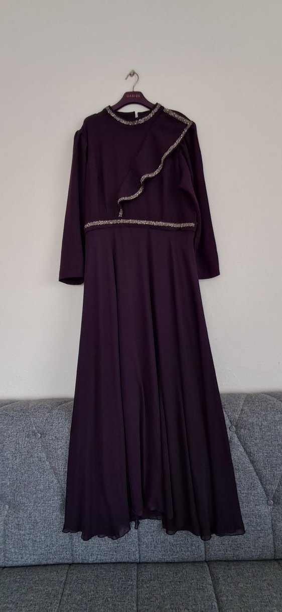 Bu uzun mor abiye elbise, yüksek yakalı ve uzun kollu, bol kesimdir. Drapeli detaylar ve ince süslemeler içerir, düğün için uygundur. boy 148 cm bel 48 cm