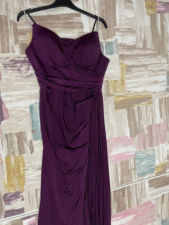 Mor renkte, drapeli ve askılı uzun abiye elbise, vücuda oturan kesimiyle şık bir görünüm sunar.