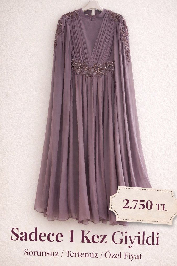 Drapeli ve işlemeli detaylara sahip, askısız yaka ve salaş kesim uzun mor abiye elbise. Klasik ve vintage düğünler için uygun. Sadece 1 kez giyildi. Bel ve omuz kısmı zarif taş işlemelidir.Herhangi bir deformasyon, leke veyaz yıpranma yoktur. Kalıbı ve duruşu oldukça şık, fotoğraflardaki gibidir. Özel günler için ideal aynı segmentteki ürünlerin mağaza fiyatları oldukça yüksektir. Temiz ve özenli kullanlmstır.Küçük bir söküğü mevcut