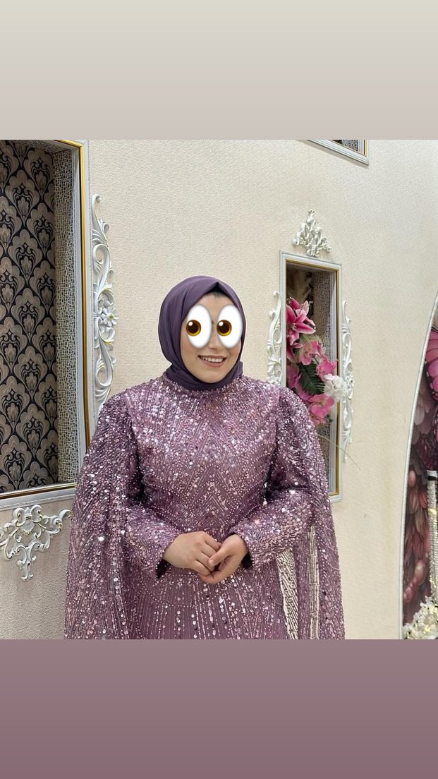 Mor, drapeli, uzun ve dar kesim abiye elbise. Yüksek yakalı, uzun kollu ve parlak etnik desenlere sahip, düğünler için uygun bir model. ✨ kiralıktır
