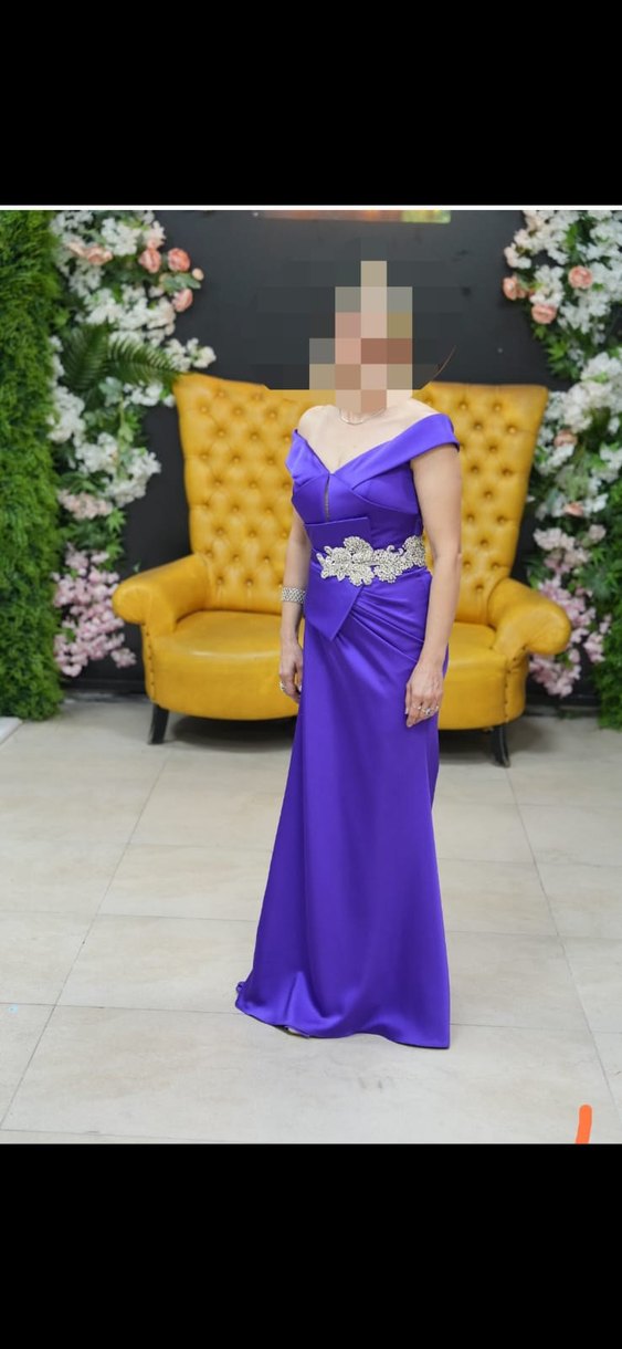 Mor, parlak kumaştan, drapeli ve desenli, straplez, kolsuz, belde süslemeli uzun abiye elbisedir. Düğünler için mezuniyet icinuygundur. 1 kere kullanıldı 160 boy 53,54 kiloda 36 ve 38 bedene uygun