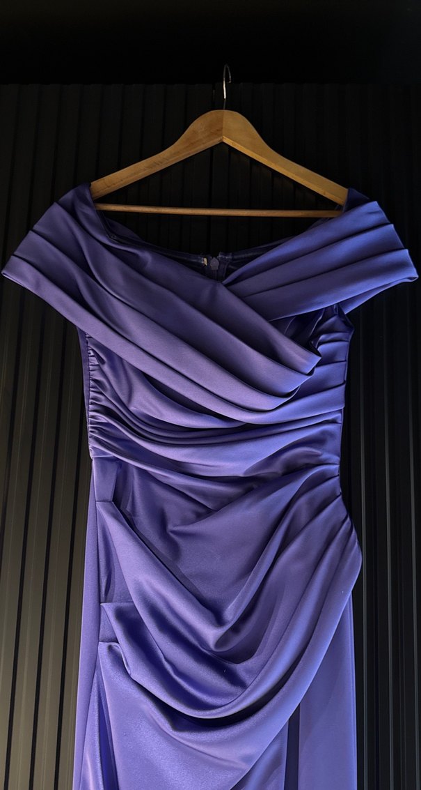 Drapeli detaylara sahip, tek parça uzun, mor abiye elbise. Kayık yaka ve ince askılarıyla göz alıcı bir şıklık sunar.