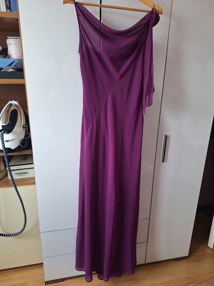 Sırtı drapeli, v yaka, mor renkte, uzun ve dar kesim abiye elbise. Minimalist ve çağdaş tarzda, romantik akşamlar için uygun. önünde etek ucunda Minik ip kaçığı var fiyata yansıttım