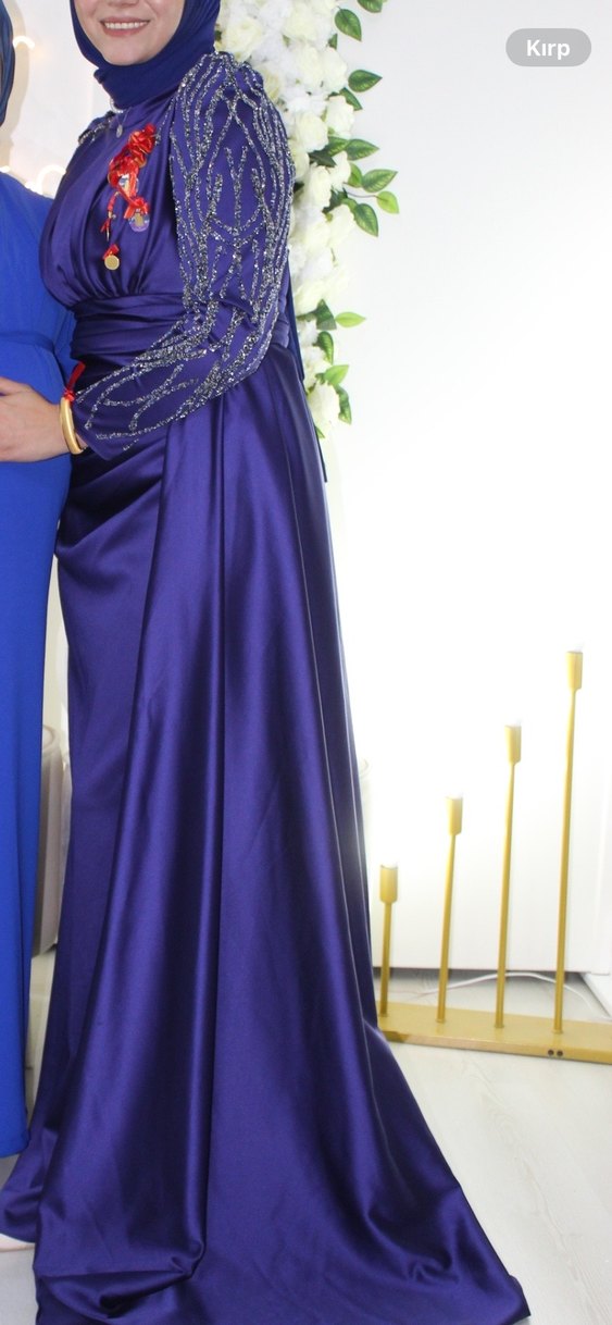 Parlak mor kumaştan, drapeli ve işlemeli detaylara sahip uzun, dar kesim straplez abiye elbise. Düğünler için uygundur.