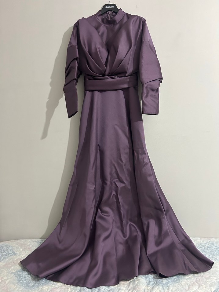Mor renk, drapeli uzun abiye elbise. Yüksek yakalı ve uzun kollu, modern klasik tarzda, düğünler için uygun. Markası Kenzel