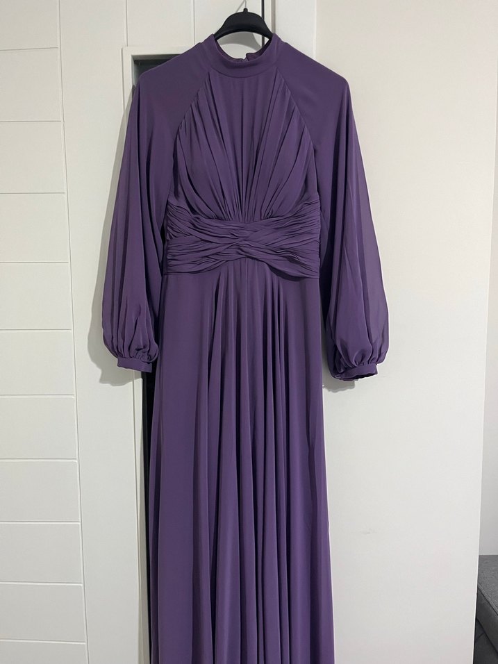 Mor renkte, yüksek yakalı ve beli drapeli uzun abiye elbise. Uzun, bol kollu ve desensiz tasarımıyla düğünlere uygun.