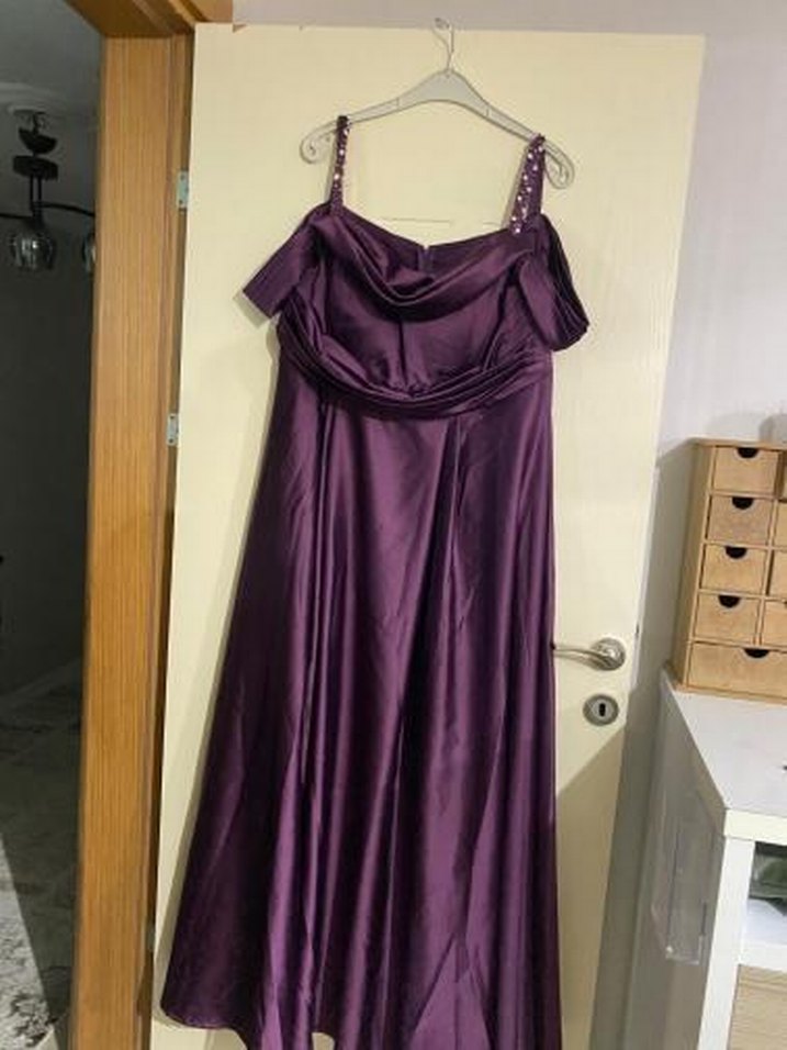 Mor, drapeli, askılı ve kolsuz uzun abiye elbise. Parlak kumaşıyla düğünler için şık ve rahat bir seçim. 1 kere giyildi ikinci el 52 beden