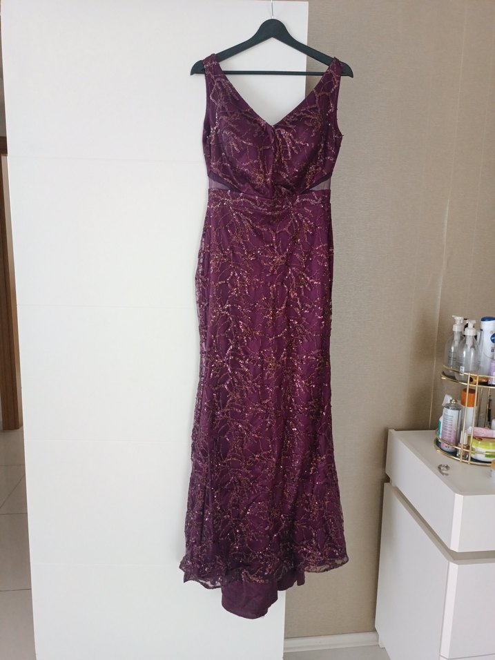 Drapeli V yaka, kolsuz, parlak mor kumaştan uzun, klasik şıklıkta abiye elbisedir.