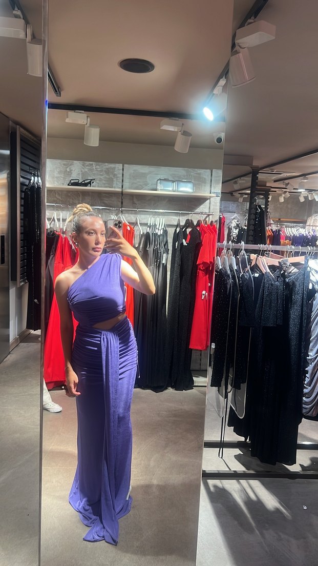AdL markası tarafından sadece beş adet üretilen özel tasarım mor, parlak tie-dye desenli, drapeli uzun abiye elbise. Straplez yakalı ve askılı kollu, vücuda oturan kesimiyle nişan, düğün, parti için uygun.