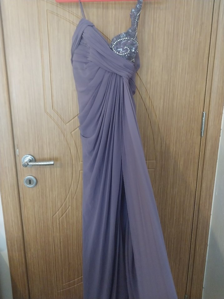 Bu morumsu gri renkte, drapeli ve askısız uzun abiye elbise, klasik ve zarif bir görünüme sahiptir. Kollu değildir ve düğünler için uygundur. 1 kere giyildi