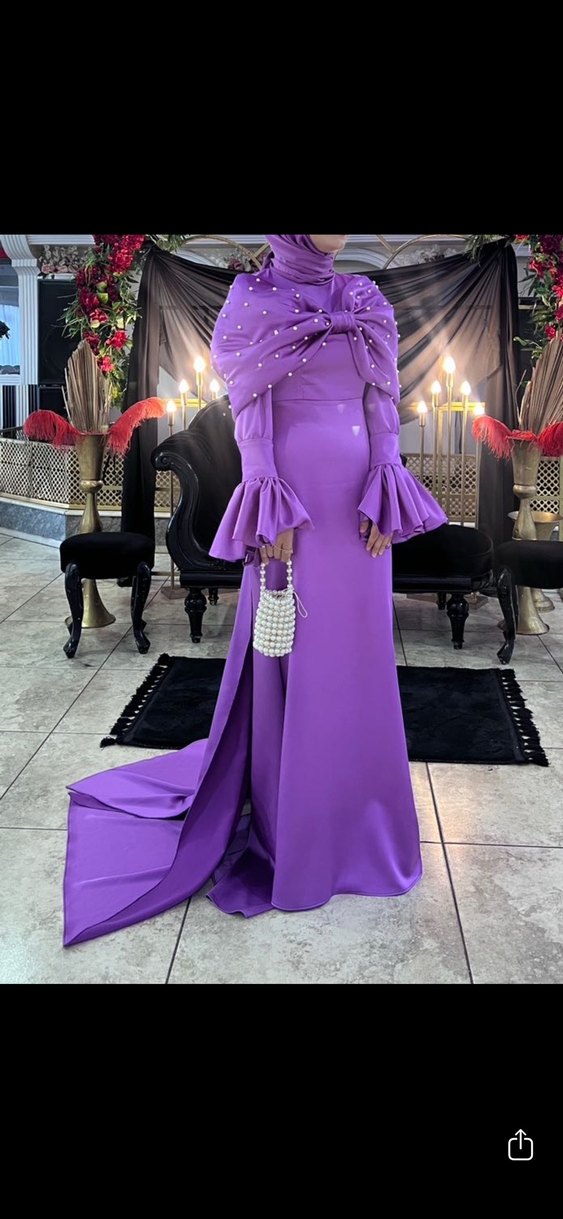 Ürün özel dikimdir. 3 saat giyildi. Hiç bir deformesi yoktur. Omuz detayı tak çıkar şeklindedir. Bu mor parlak kumaştan, drapeli, uzun kollu ve straplez yakalı, vücuda oturan uzun abiye elbisedir. Düğünler için çağdaş bir tarz sunar. ✨