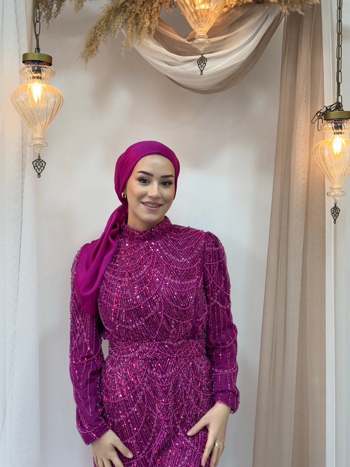 Mor Drapeli Uzun Abiye Elbise Tesettür