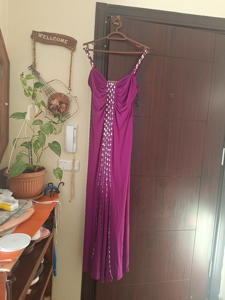 Bu mor drapeli uzun elbise, parlak tie-dye deseni, V yakası ve askılı kollarıyla bohem tarzda, düğünler için uygun bir modeldir. pazarlık payı vardır sadece bir kere giyildi
