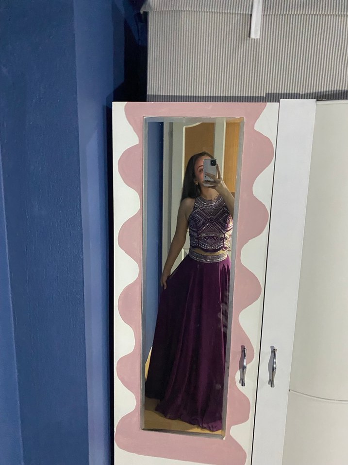 Mor renkte, drapeli ve yüksek yakalı uzun bohem kadın elbisesi. İnce askılı, tie-dye desenli ve fit kesimiyle dikkat çeker. Üst ve altı ayrı giyiliyor takım şeklinde