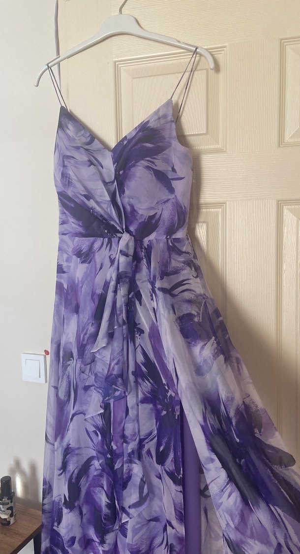 Askılıksız, straplez Mor bağlamalı desenli, drapeli tasarıma sahip. Düğünler için uygun, yumuşak sentetik kullanılmış. Sadece 1 kere giyildi ve temiz bir şekilde beklemektedir.