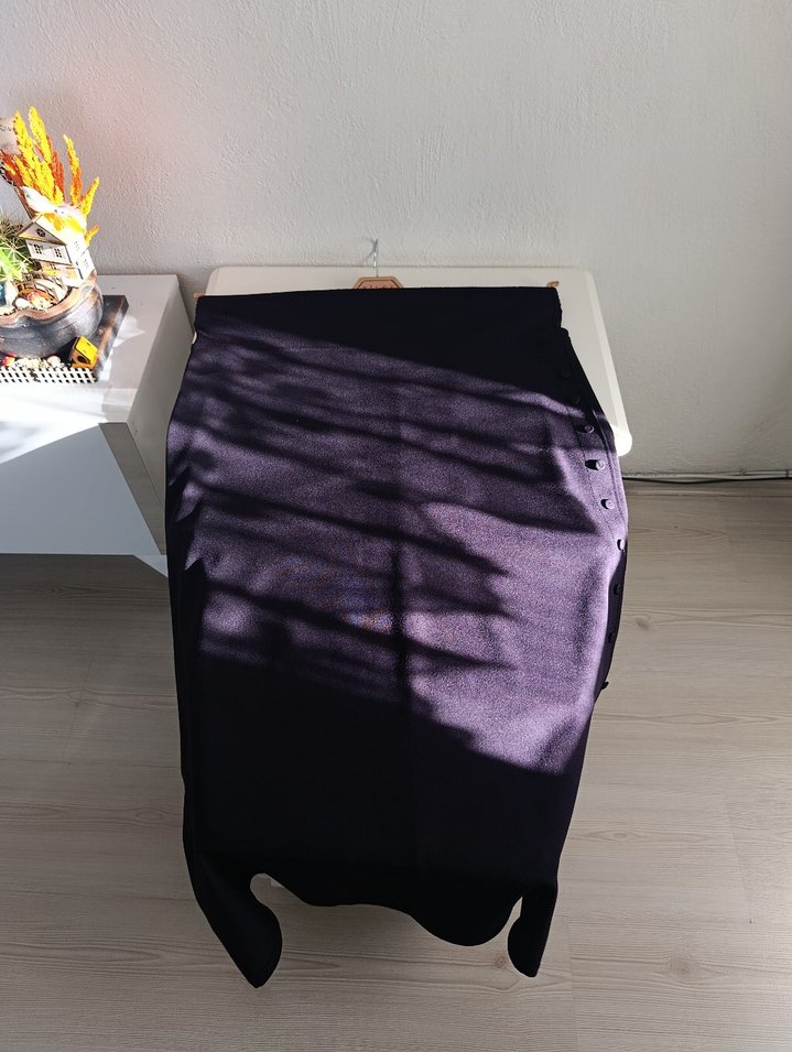 Mor renkte, sentetik kumaştan yapılmış, drapeli ve vücuda oturan midi uzunluğunda hamile eteği. Minimalist goth tarzıyla günlük kullanıma uygun. siyaha yakın bir mor patlıcan moru çok güzel