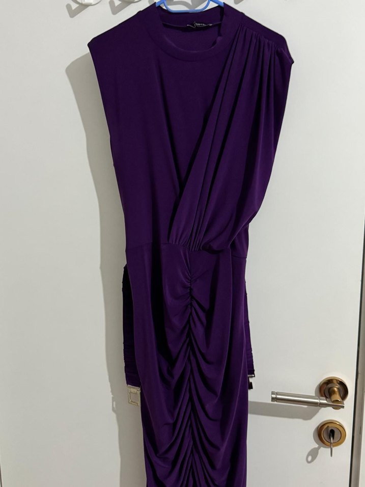 Yüksek yakalı, kolsuz ve vücuda oturan uzun mor elbise. Drapeli detaylarıyla avangart bir tarz sunar. Pürüzsüz sentetik kumaştan üretilmiştir.